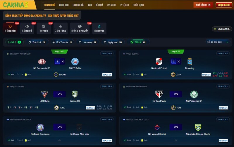 Khi truy cập vào Cà Khịa TV, cảm giác đầu tiên là sự gọn gàng và trực quan. Thay vì nhồi nhét quá nhiều chi tiết, trang chủ đưa thẳng người xem đến trọng tâm: danh sách các trận đấu đang và sắp diễn ra.