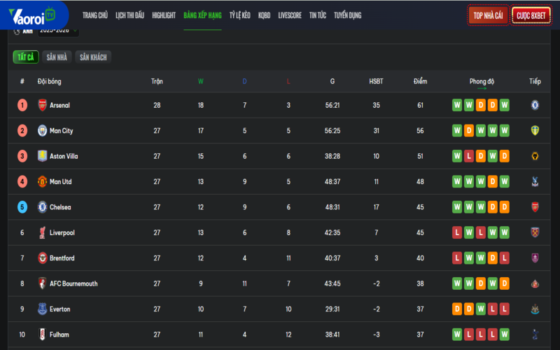 Thông tin về lịch trình thi đấu và cục diện bảng xếp hạng được cập nhật liên tục, hỗ trợ người hâm mộ theo dõi sát sao hành trình của đội bóng mình quan tâm.