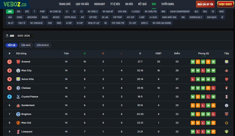Nếu anh em hỏi tôi rằng trang web nào vừa xem bóng sướng, vừa soi kèo đủ dữ liệu, lại có bảng xếp hạng bóng đá a n h cập nhật nhanh như chớp thì tôi sẵn sàng trả lời ngay: VeboTV. Không phải vì tôi thiên vị hay quảng cáo gì, mà vì thật sự, trong vô số website bóng đá tôi từng dùng, VeboTV là nơi hiếm hoi giúp tôi nắm trọn Premier League “chỉ trong một cái lướt”.