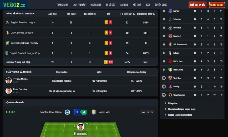 Ví dụ: Nếu thấy Aston Villa toàn thắng sân nhà nhưng thường mất điểm sân khách, anh em biết ngay nên đặt kèo nào cho hợp lý. Đây chính là điểm mà tôi thấy VeboTV vượt trội so với nhiều site bóng đá khác. Không phải chỉ đưa BXH lên rồi để đó, mà còn cho thêm dữ liệu giúp anh em đưa ra quyết định đúng đắn hơn.