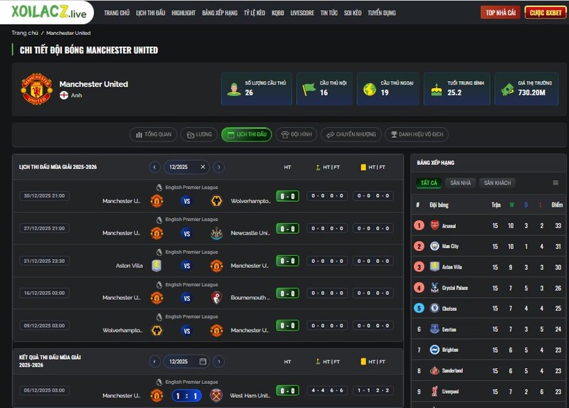 Lịch thi đấu m.u hiển thị trực quan và chi tiết tại Xoilac