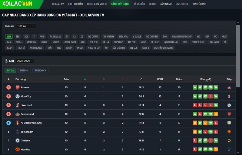 Tại Xoilac Vnn, người xem có thể theo dõi bảng xếp hạng của:
